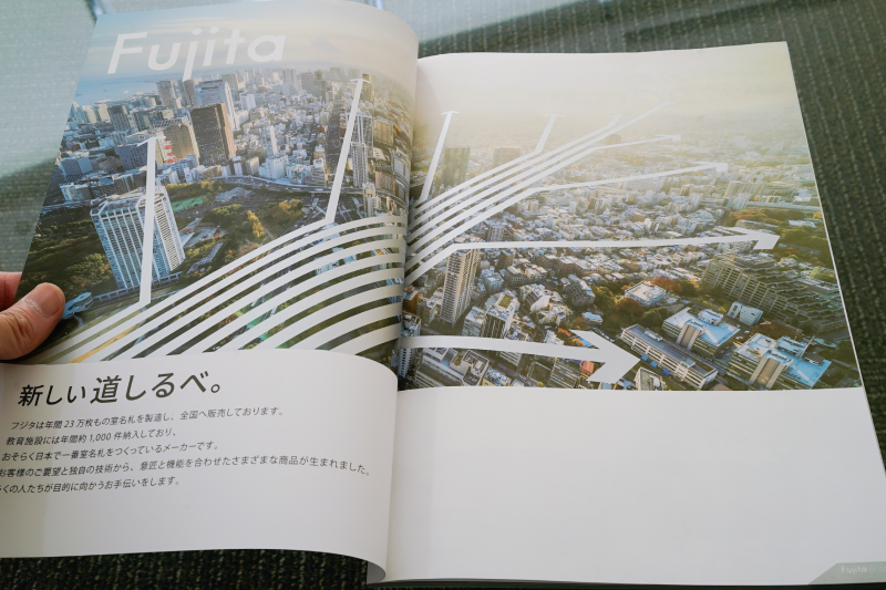 室名札・学校教室の名札のメーカー(株)フジタの営業用パンフレット。ブランドイメージを大切にした、主張しすぎないが丁寧で洗練されたデザインが印象的