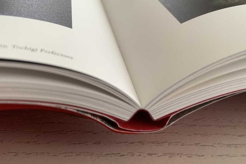 さらに、本がしっかり開いて見やすいように、クータバインディングという手法で製本しています。背に筒状の紙(クータ)を貼り、背表紙と本体の間に空洞をつくることで、手で押さえなくても本が閉じにくくなっています。さらに、クータの内側も赤に統一して…。」